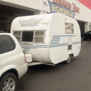The first article of business upon closing the deal for Lola was to buy her a new pair of shoes. The old tires were shot and not worth the risk of driving the 200+ miles home on them. We drove directly from the ballpark to the nearest tire shop and purchased two new tires. It took an hour, or so, to get started and I took the opportunity to further examine the trailer and take a few pictures.